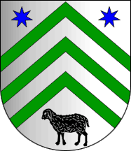 Shield Argent three chevronels Vert ,accompanied in chief by two seven pointed estoiles and in base by a sheep passant Sable garnished Or.
