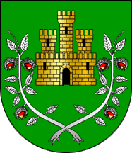 Shield Vert a castle Or masoned and open and slit Sable, flanked in orle by two chestnut boughs Argent with their burrs cracked Gules and their proximal ends in saltire at base.