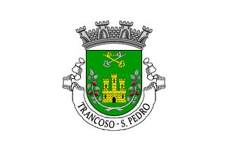 Mural crown Argent with four visible towers (town rank) and white scroll reading in black upper case serifed letters "TRANCOSO - S. PEDRO".