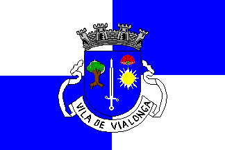 Shield Azure a sword Argent in pale, flanked at dexter by an eradicated tree proper and at sinister by a radiant sun Or under a carnation blossom Gules. Mural crown Argent with four visible towers (town rank) and white scroll with inscription in black initials "VILA DE VIALONGA".