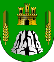 Shield Vert a craggy hill Argent garnished Sable and a castle Or masoned Sable with port and windows of the same, both set per pale, flanked by two wheat ears Or. Mural crown Argent with three visible towers (village rank) and white scroll reading in black upper case serifed letters "TELÕES - VILA POUCA DE AGUIAR".