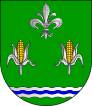 Shield Or a plough Azure,n chief a palm frond Vert, on base wavy Azure a bar wavy Argent. Mural crown Argent with three visible towers (village rank) and white scroll reading in black upper case serifed letters "AZÕES".