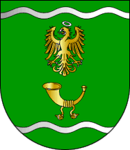 Shield Vert an eagle volant debilitated Or armed Argent with nimbus of the same and a bugle horn Or, both arrayed in pale between two barrulets wavy Argent.