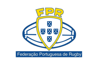 The flag is white with a white rugby ball garnished blue in horizontal position, superimposed by a white inescutcheon fimbriated yellow and charged with five blue escutcheons in cross, each charged with a quina, all crested by yellow initials "FPR". At bottom on a blue rectangle is the full name in white.
