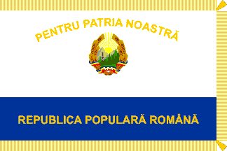 Under the coat of arms, on the same side of the flag, in a straight line, is written with golden letters: "THE PEOPLE'S REPUBLIC OF ROMANIA".