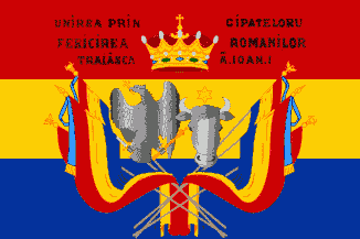 Alex Danes, 3 September 2008It was not until 1866 that the vertical tricolour finally became the national flag of Romania. In the meantime the horizontal red-yellow-blue flag was used while the war ensign in 1863 changed its emblem, replacing the old one with an eagle bearing the crowned shield of the state on his breast, holding a sword and a sceptre and with the words "HONOR