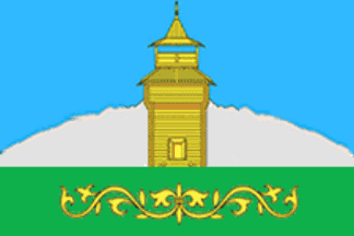 Its flag depicts a tower on a green base and in front of a grey hill and blue sky. Yellow scroll work decorates the lower green band.