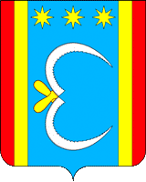 In an azure (blue, light blue) field between the dissected narrow edges of the shield, gules (red) on the outside and gold on the inside - two facing silver jagged sickles with gold handles, crossed with handles, the upper one with the handle down and to the right, the lower one - up and to the right; at the head - three golden eight-pointed stars in a row.