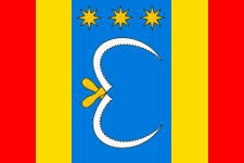The flag is a rectangular panel with a width-to-length ratio of 2:3, divided into five vertical stripes—red, yellow, light blue, yellow, and red, with an area ratio of 4:4:11:4:4. The light blue stripe features the coat of arms in white and yellow: three stars above two crossed sickles.