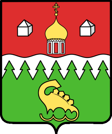 In a field crossed with gules and greens, a silver belt, wavy at the top and spruce-shaped at the bottom; at the top, a golden church dome on a silver drum with through windows, accompanied on the sides by silver mortars of salt; at the bottom, a golden dinosaur in reverse with four crests.