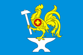 The flag of Morgaushsky District is horizontally divided yellow over deep red, 1:3 by a wavy separation, with three 8-pointed stars in the yellow field and a white ribbon decorated with dark red 8-pointed stars from which arises a branch of oak with acorns in the middle and at each end three heads of wheat, all yellow.