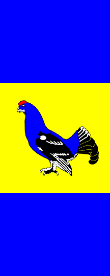 The flag is rectangular, in proportions 2:5, vertically divided in three fields, the first and third are (cobalt) blue and the middle one is square of yellow colour. It contains the bird from the coat of arms, prescribed to be not not lower then 70% of the hoist and not higher than 90% of it.