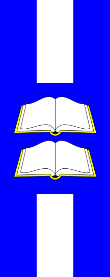 The flag is divided blue-white-blue, interrupted with a central square part being all blue and containing two opened books one over the other. At least this is how I understand the description in the Decision, which seems quite convoluted.