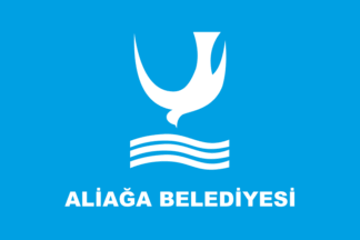 The flag of Aliağa (photo) is blue with the municipality's emblem. The former flag of Aliağa was white with the emblem in a different color scheme. "Belediyesi" means "Municipality".