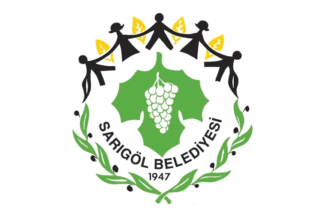 The flag of Sarıgöl, used horizontally (photo) or vertically (photo, photo), is white with the municipality's emblem. "Belediyesi" means "Municipality".