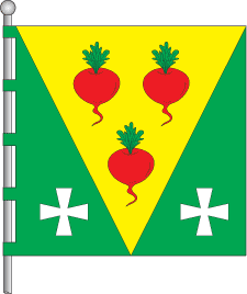 "Rectangular green panel, from top corners to the middle of bottom edge is going yellow wedge, on it is three red beets with green leaves, two and one. On the parties are two white paty cross."