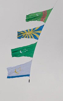 On Wikipedia [a helicopter tows] what seem to be the flags of the Armed Forces of Turkmenistan. Perhaps from top to bottom: the national flag, the flag of Air Force, the Army flag and the flag of the Navy?. Does anyone have news on these flags? Do [we] have pictures in FOTW-gifs?