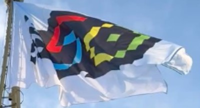 This "Microsoft 50th Anniversary flag" was seen atop the Seattle "Space Needle"