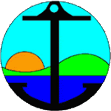 Quite an unusual flag for an American city, the flag of Pittsburg employs a simplified rendition of the city logo of an anchor before a rising sun (see city website) against a wavy white and blue background.