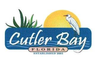 A large image of the town logo is shown on the Miami-Dade County website. The logo shows the sun and green plants over the sea (shown as a blue cartouche with three lighter blue waves) and a heron, and bears the writings "Cutler Bay" (in white letters on the sea), "FLORIDA" (in black letters in a pink cartouche) and "ESTABLISHED 2005" (in blue letters under the cartouche).