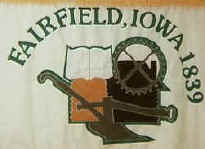 The Fairfield flag is a white field, with a central emblem consisting of overlaid black building, white open book, cogwheel, plow and a brown object, with the words FAIRFIELD, IOWA 1939 arched over it.