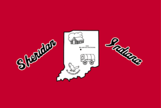 If I had to describe the dimensions, the flag has roughly the same aspect ratio as the U.S. State of Wyoming: square-ish but not perfectly square. It's red and contains a white silhouette of Indiana outlined in black, three objects inside said silhouette, an annotation, and the words 'Sheridan' and 'Indiana' in black cursive outlined white on either side of the silhouette tilted upwards and downwards respectively at a 45 degree angle.