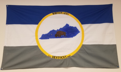 The flag is a horizontal tricolor of blue-white-gray. In the center is an emblem made of a golden ring with the town's name at the top, and the state's name at the bottom, bisecting the town's establishment year of 1888. In the center is the blue outline of the state of Kentucky, and a golden star marks the town's location within the state. Next to the star in the center of Kentucky is a bison, which seems to be a frequent symbol of the city.