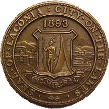 The flag of the City of Laconia, New Hampshire, was adopted by the city council on 22nd April 1965. Designer was Frank DeCoster. Rectangular flag divided in four triangles. In the center is positioned the outline of the Lake Winnipesaukee and city seal over it. "LACONIA NEW HAMPSHIRE" on the lower triangle. City seal is black on gold, lettering is gold with black outline, lake is dark blue, top triangle is international green, bottom triangle is international blue and side triangles are white.