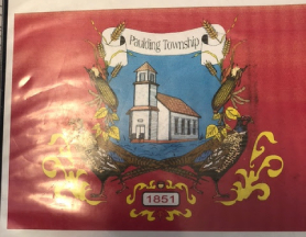 The flag is a red field with a crest-like emblem in the center. It is blue with the depiction of the historic St. Paul Church, which is located on Town Highway 114 about 3 miles southwest of the village of Paulding. Above the church is a white ribbon with the township's name on it. A wreath is formed around the church using starting with a pheasant, then a branch of leaves, a cob of corn, and wheat at the top. Next to the pheasant is a golden baroque drapery. At the bottom of the flag is a white box with the township's establishment year on it. Above the box is an acorn, with more drapery around it.