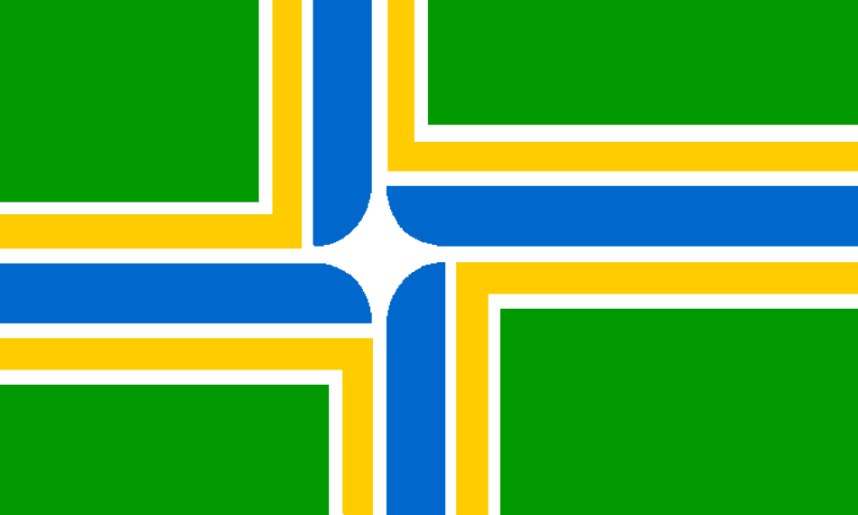 There is designated an official flag for the City to be known as the City Flag and described as follows: The standard size measures 5 feet in length by 3 feet in height. The background shall be green, symbolizing the forests and our green City. The design includes a four-pointed directional star, formed by the vertical and horizontal intersection of counterchanged blue stripes, symbolizing our rivers. The blue stripes are paralleled with yellow stripes, symbolizing agriculture and commerce. The yellow stripes are separated from the green background and the blue river stripes by white lines called fimbriations. The white central star is positioned slightly left of center, toward the staff end of the flag, called the hoist. (Ordinance 176874, amending Portland’s City Code Section 1.06.010.)The ordinance specifies the components in one-inch units: The star is 9 units high and wide, formed by 4-unit-radius quarter-circles. The center point of the star is 26.5 units from the hoist and 17 units from the top. The canton is 18 units wide by 13.5 units high, the second quarter is 30 units wide and 8.5 units high, the third quarter is 23 units wide and 8.5 units high, the fourth quarter is 25 units wide and 13 units high. The blue stripes are 4 units wide, the white stripes are 1 unit wide, and the yellow stripes are 2 units wide. (These result in a flag 34 units high by 60 units wide.) The colors are Kelly or Irish Green, U.N. Blue, Gold, and White.