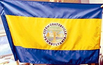 The flag of the City of Coatesville, Pennsylvania, is horizontally divided blue-yellow-blue, with the yellow stripe wider and city seal on the central stripe. Photo is here: www.dailylocal.com/articles/2010/10/04/news/srv0000009546184.txt. The seal can be seen at www.coatesville.org/images/cityseal.gif.