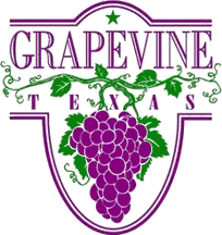 A white flag with the city logo - a bunch of purple grapes hanging from a green vine, the city and state name written in purple, and a small green star above.