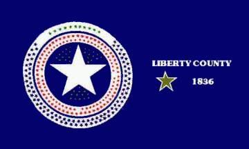 As the text says, Falls Co. took this design, then Hidalgo Co., then Liberty Co., the differences being the name, date, and the colour of the lone star which represents the county. Denton Co. uses a flag which is superficially similar (round seal offset to hoist, name of county in fly, all on a blue flag).
