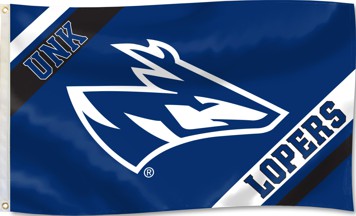 An institutional flag of the University of Nebraska at Kearney (obtained from https://m.media-amazon.com/images/I/61w9hGrLg7L._UF1000,1000_QL80_.jpg)) is blue with the UNK letters in white.