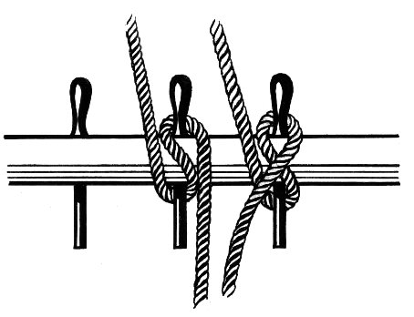 An increasingly obsolete method of securing the halyard by means of movable vertical pins (fitted into a frame or rack at the foot of the mast) and now largely replaced by the cleat – a tack pin or jack pin (see also cleat and halyard).