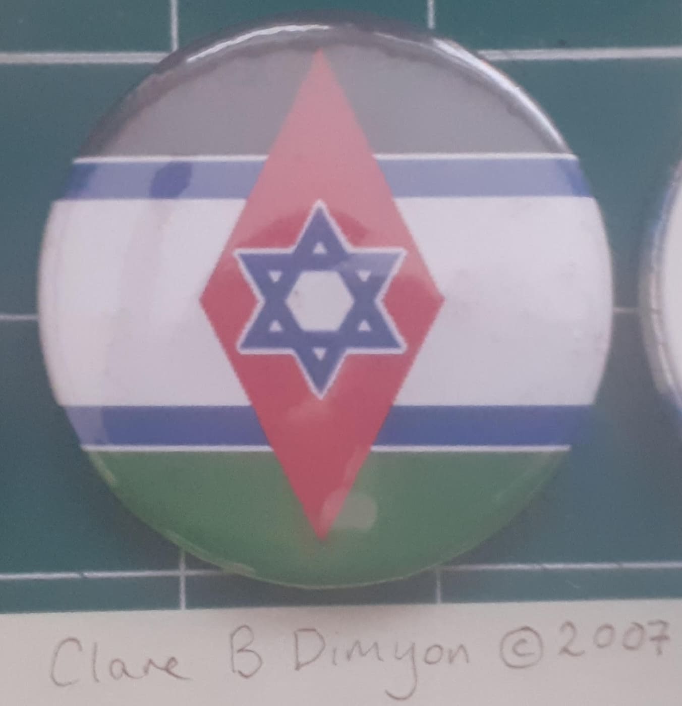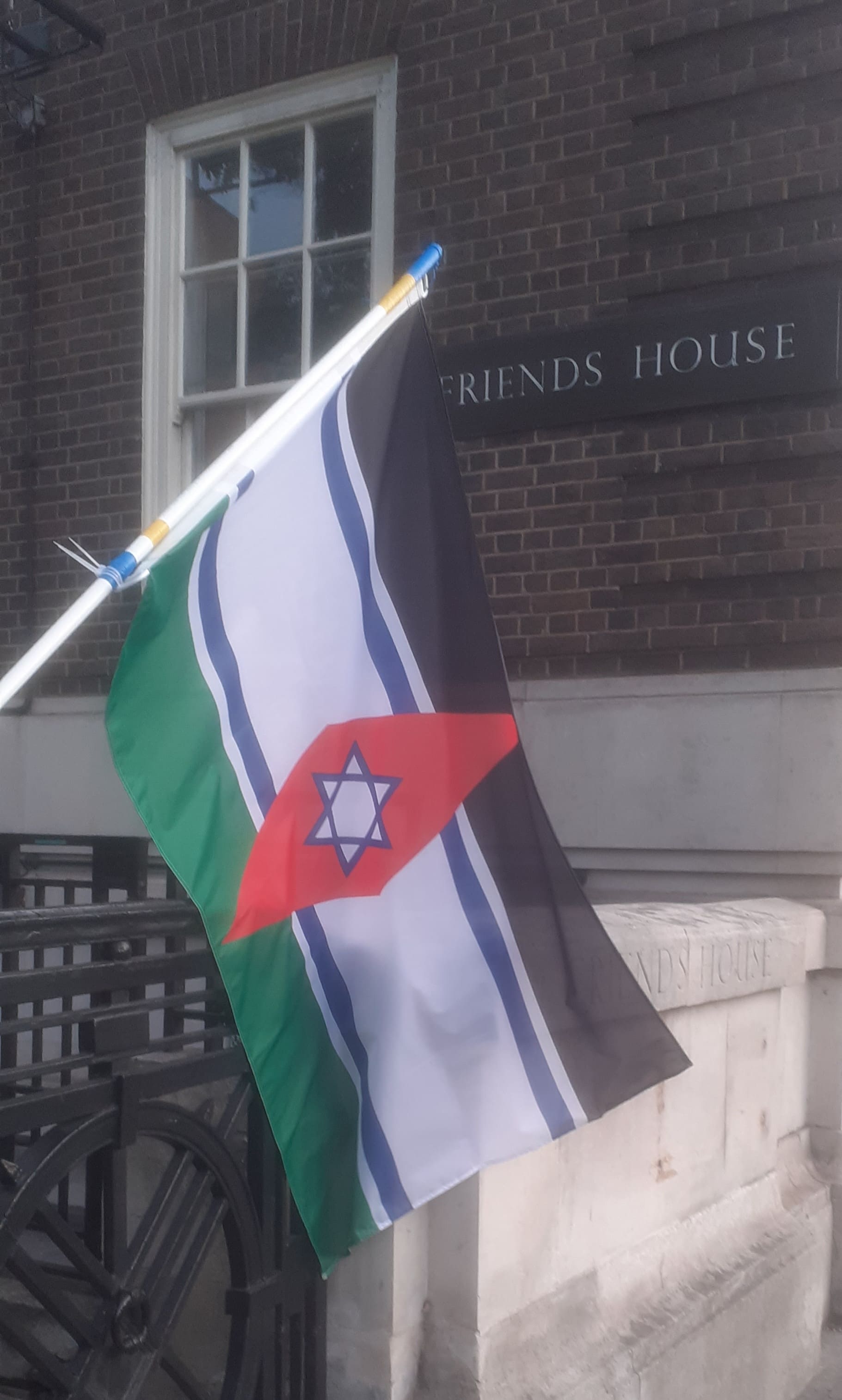 Caption: pictured is a "One State" flag of a united Israel-Palestine. It