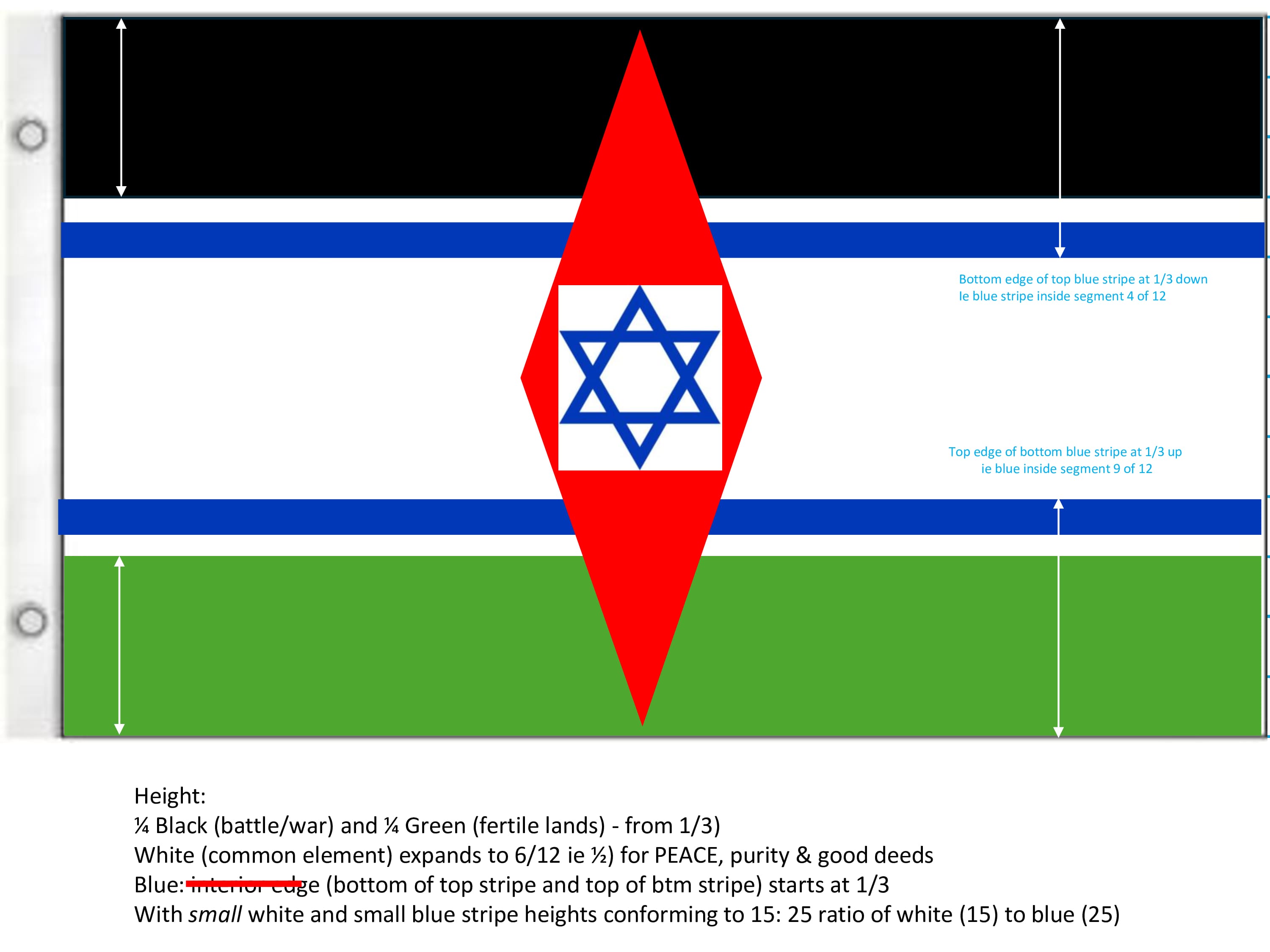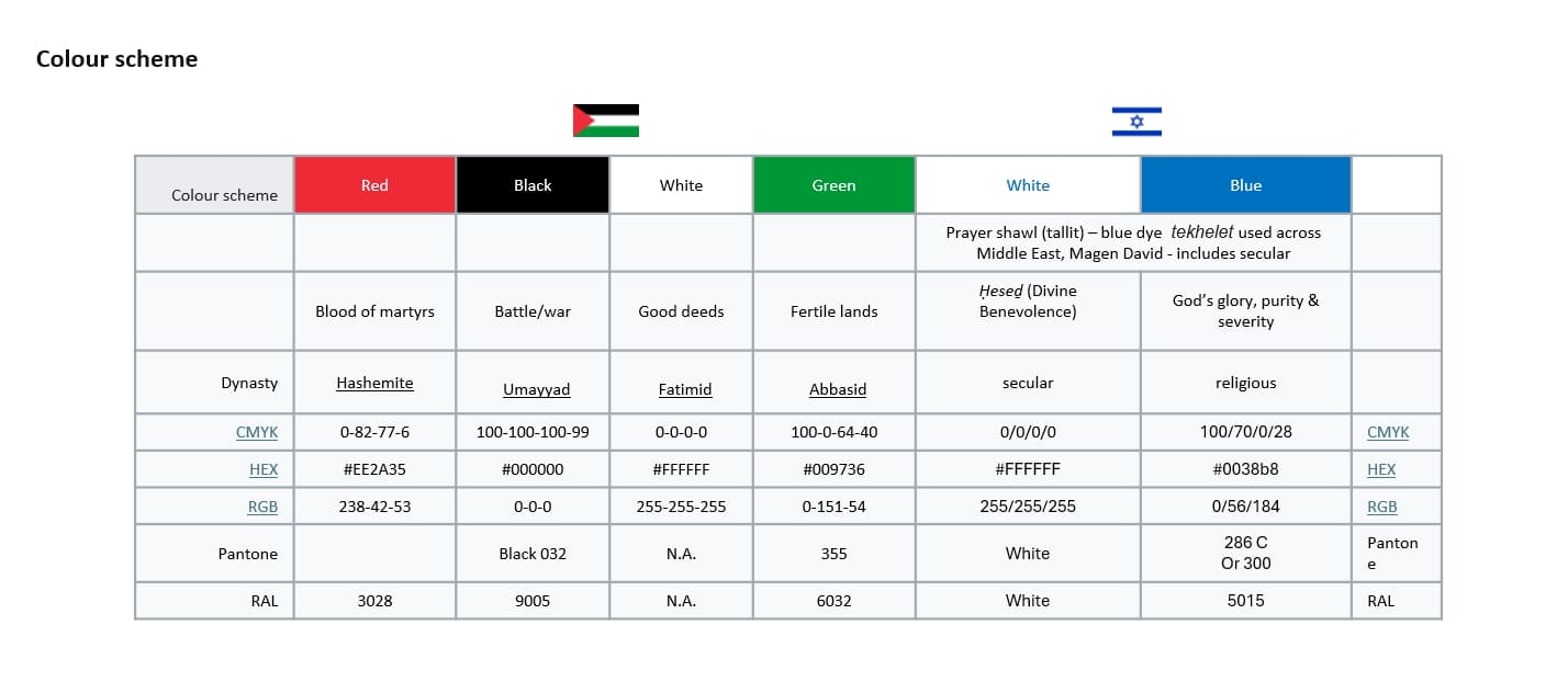 Purely in design terms (and in a politically-neutral sense), these are not bad proposals: they retain one distinctive element (the horizontal stripes) from both the Israeli ands Palestinian flags while dropping one other distinctive element from both (the red triangle and Magen David.)