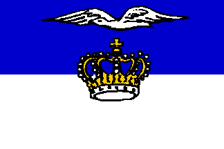 In August 1974 French police arrested a swindler who styled himself the Grand Duke of the Principality of Freedomland, Count Othmar di Schmieder Rocca-Forozata. It would seem as though this Freedomland was not the same territory as Cloma's Freedomland; contradictorily also called the Republic of Koneuwe, it was described as consisting of 74 islands 2,000 miles from Borneo. The flag of this Freedomland was described as a horizontal bicolor of blue over white with a gold crown in the center surmounted by a white flying albatross.